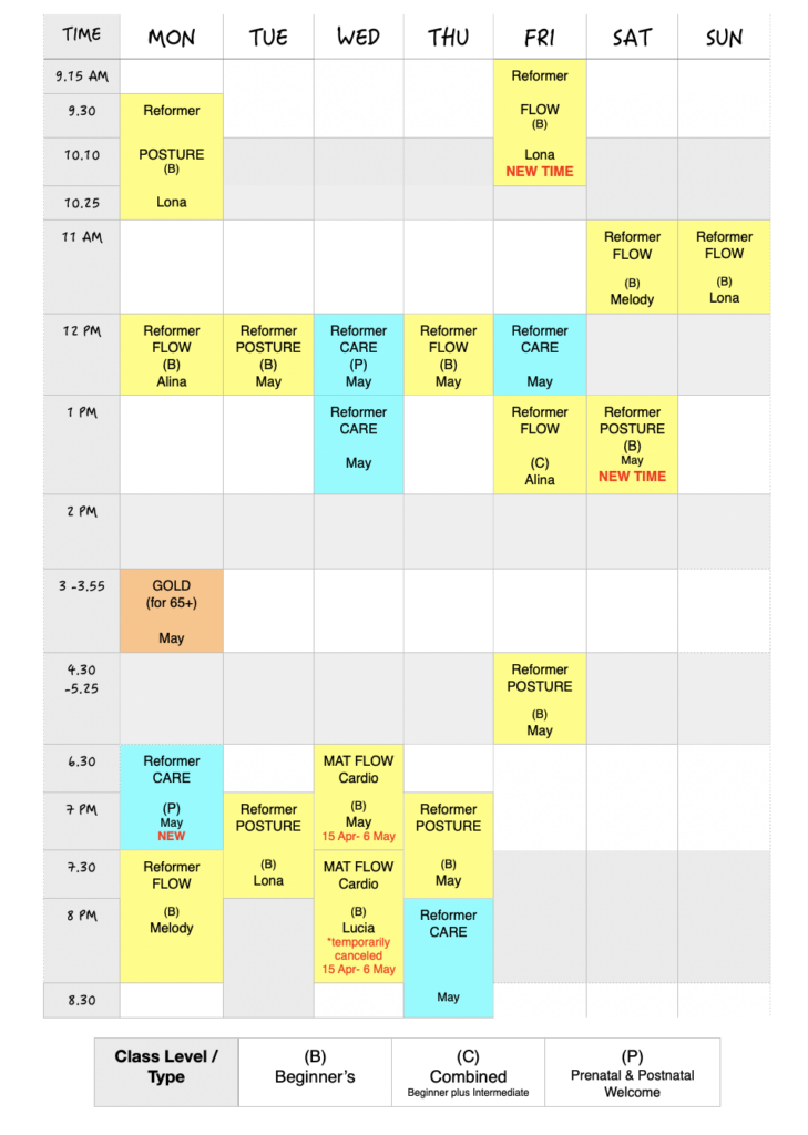 If you are very active but have muscular pain or tightness, try our Reformer Care classes for a different pace and exercise focus.Pre & Postnatal (P): Reformer Care classes with “P” in brackets are open to Pre & Postnatal participants.